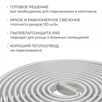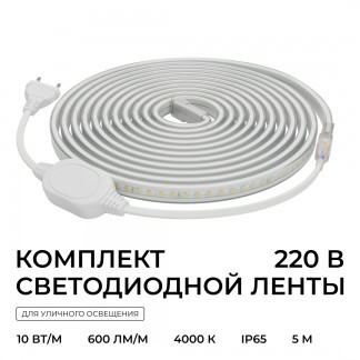 Комплект светодиодной ленты Apeyron 220В 10Вт/м, 600лм/м, 6500К (х/б), SMD2835, 120д/м, 13,5х7мм, 5м, IP65, с аксесcуарами (сетевой шнур, заглушка - 1шт, крепеж - 5шт) 10-142 Артикул: