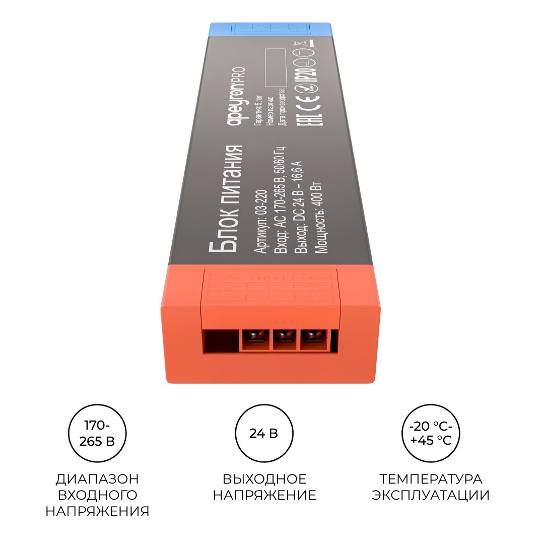 Блок питания Apeyron PRO 24В, 400Вт, 170-265В, 16,6А, IP20 03-220✖Добавить к сравнениюПерейти к сравнению