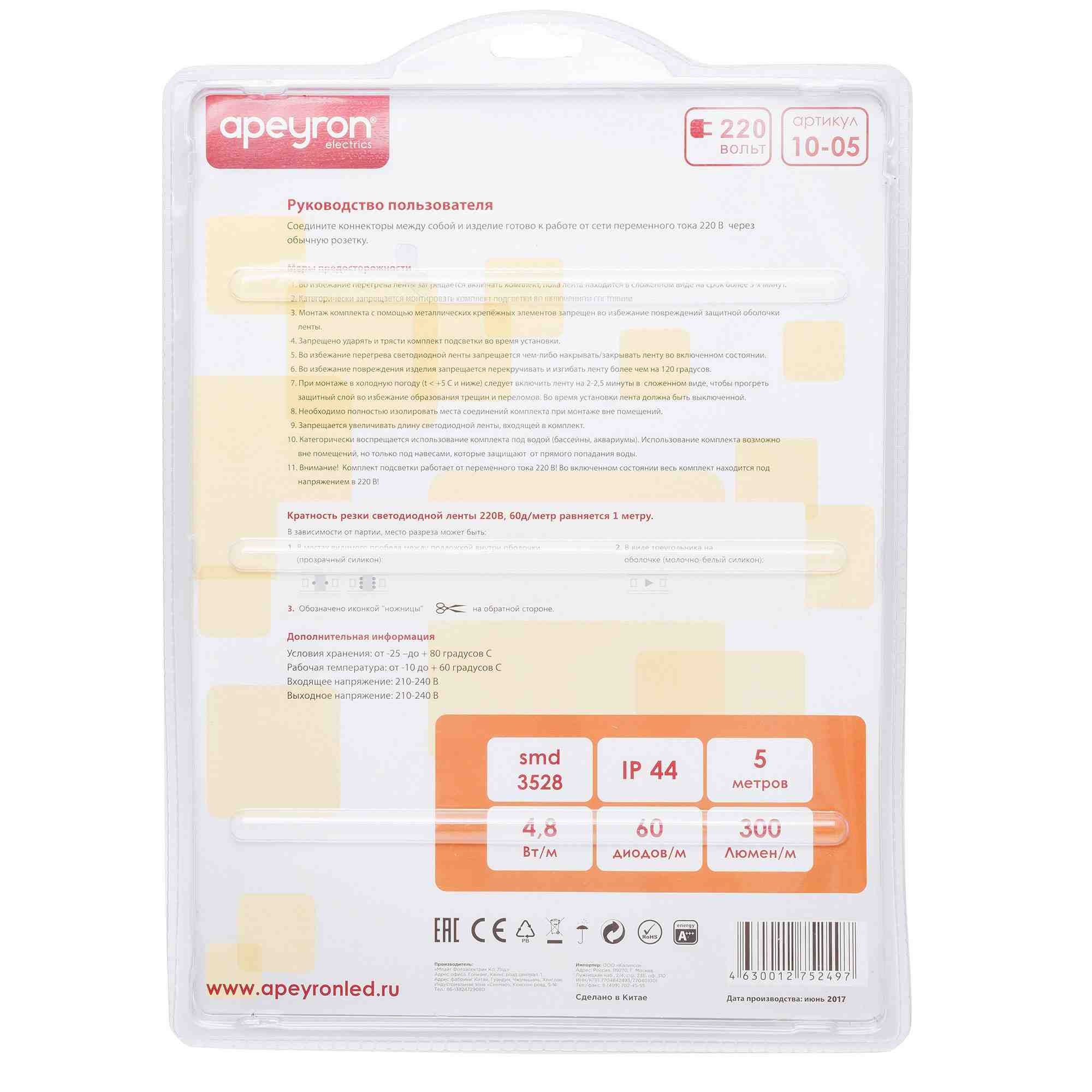 Комплект светодиодной ленты Apeyron 220В 4,8Вт/м smd3528/2835 60д/м IP65 300Лм/м 5м 3000К (сетевой шнур, заглушка, крепежи) 10-05✖Добавить к сравнениюПерейти к сравнению