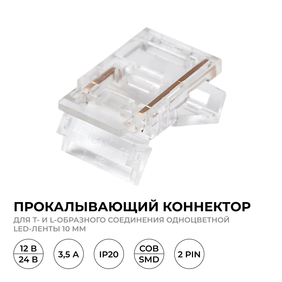 Коннектор прокалывающий тип L, T, 2 pin, для одноцветной LED ленты 10 мм, тип SMD, COB Apeyron 09-165✖Добавить к сравнениюПерейти к сравнению